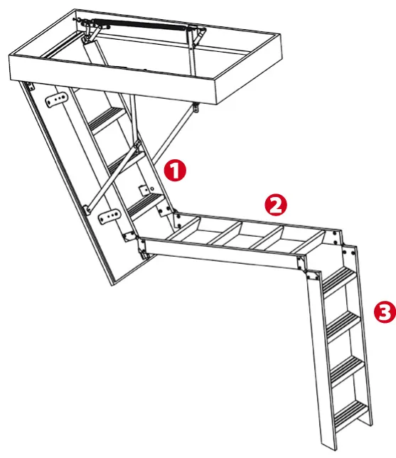 Термоизоляционная крышка типа "сэндвич", толщиной 30 мм, облицована с двух сторон ДCП древесного цвета. Короб люка с уплотнителем. Все металлические элементы лестницы покрашены порошковой краской, ступени лестницы имеют антискользящие насечки и закреплены в столярное соединение «ласточкин хвост», что позволяет выдерживать нагрузку 150 кг. Деревянный стержень для открывания лестницы в комплекте. Две последние секции разобраны. С помощью дополнительной секции высоту лестницы можно увеличить на 55 см.