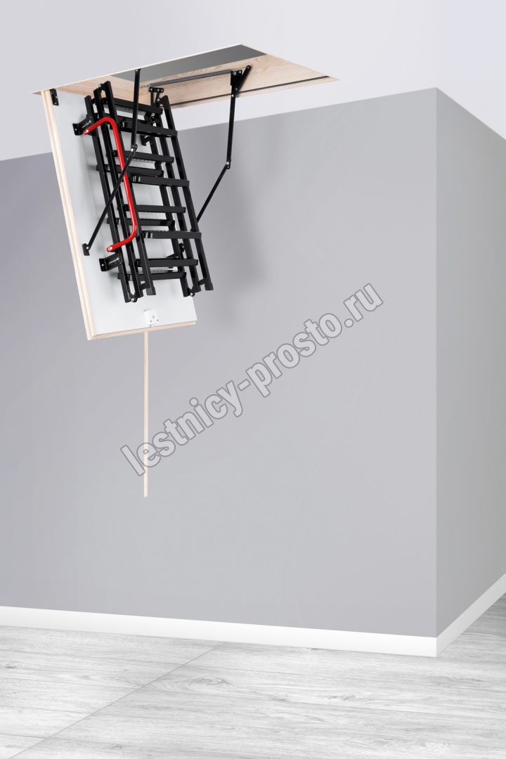 Лестница складная трехсекционная. Рабочая поверхность полностью выполнена из металла и покрашена порошковой краской. Термоизоляционная крышка типа "сэндвич", толщиной 47 мм, утеплена пенопластом, облицована с двух сторон ДCП белого цвета.