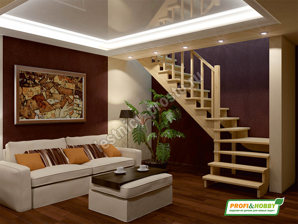 Базовый комплект включает в себя деревянные элементы лестницы и ограждения без какого-либо покрытия.