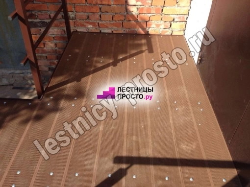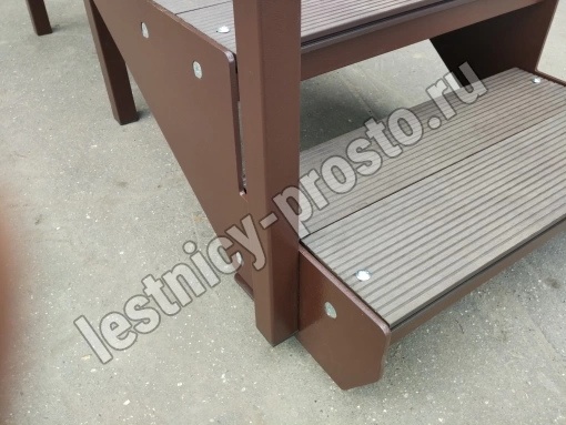 Ступени лестницы состоят из металлической рамки, обеспечивающей необходимую прочность, и покрытия из террасной доски ДПК (древесно-полимерный композит). Ступени не боятся воды и мороза, не теряют со временем свой внешний вид и не требуют ухода.