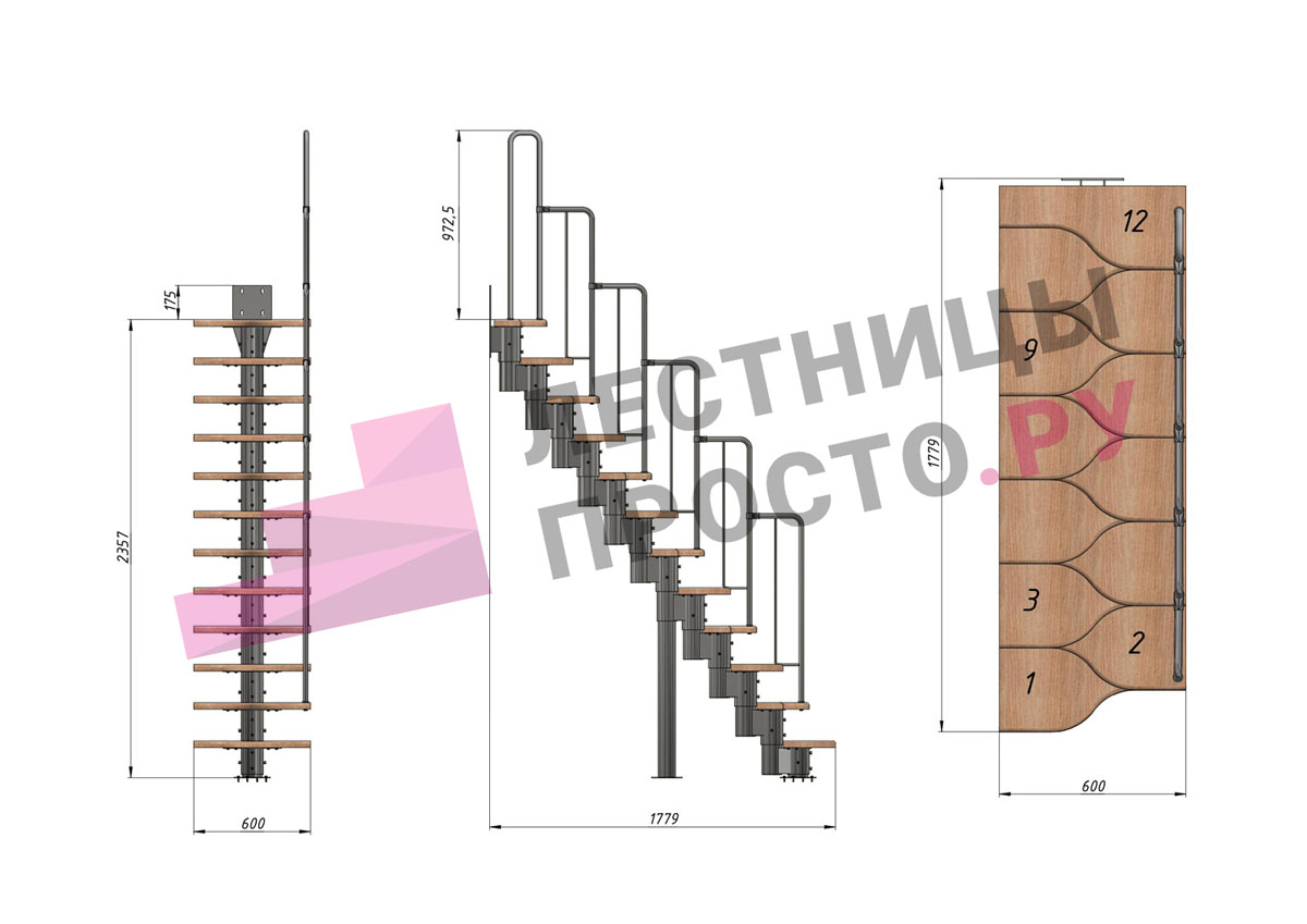 Лестница Prosto Urban Black гусиный шаг 600 мм, h216-312 см (12 ступеней), бук