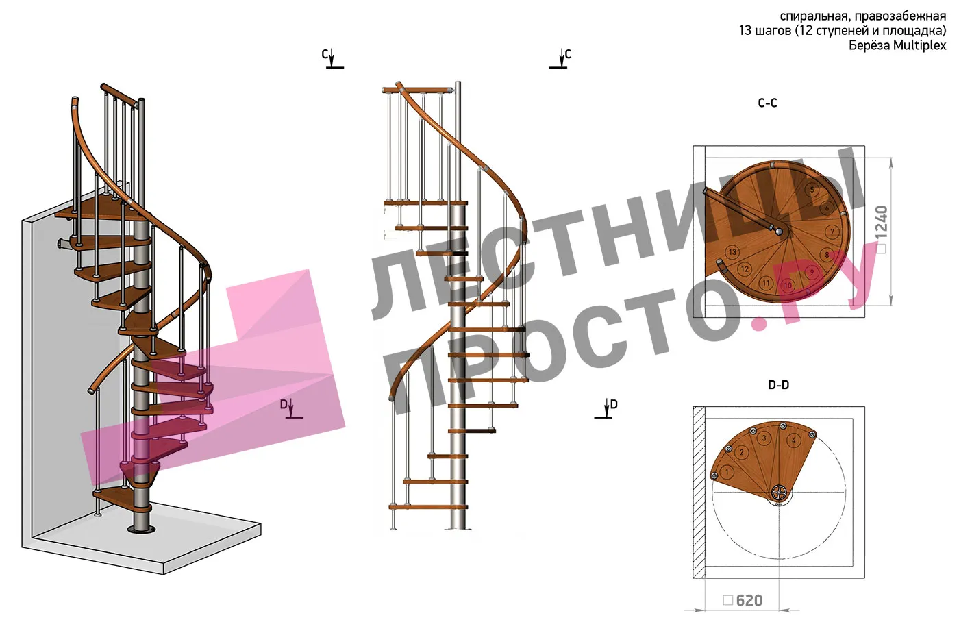 Ширина ступени между стойками и центральной колонной ≈ 48 см
