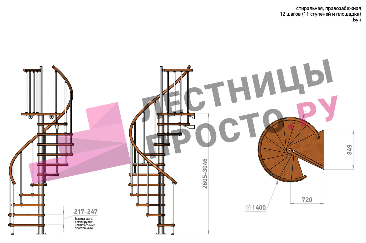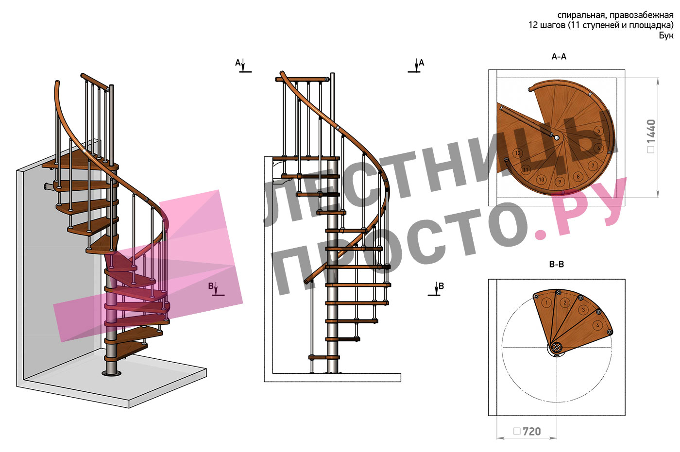 Правая, d=140см, 11 ступеней + площадка