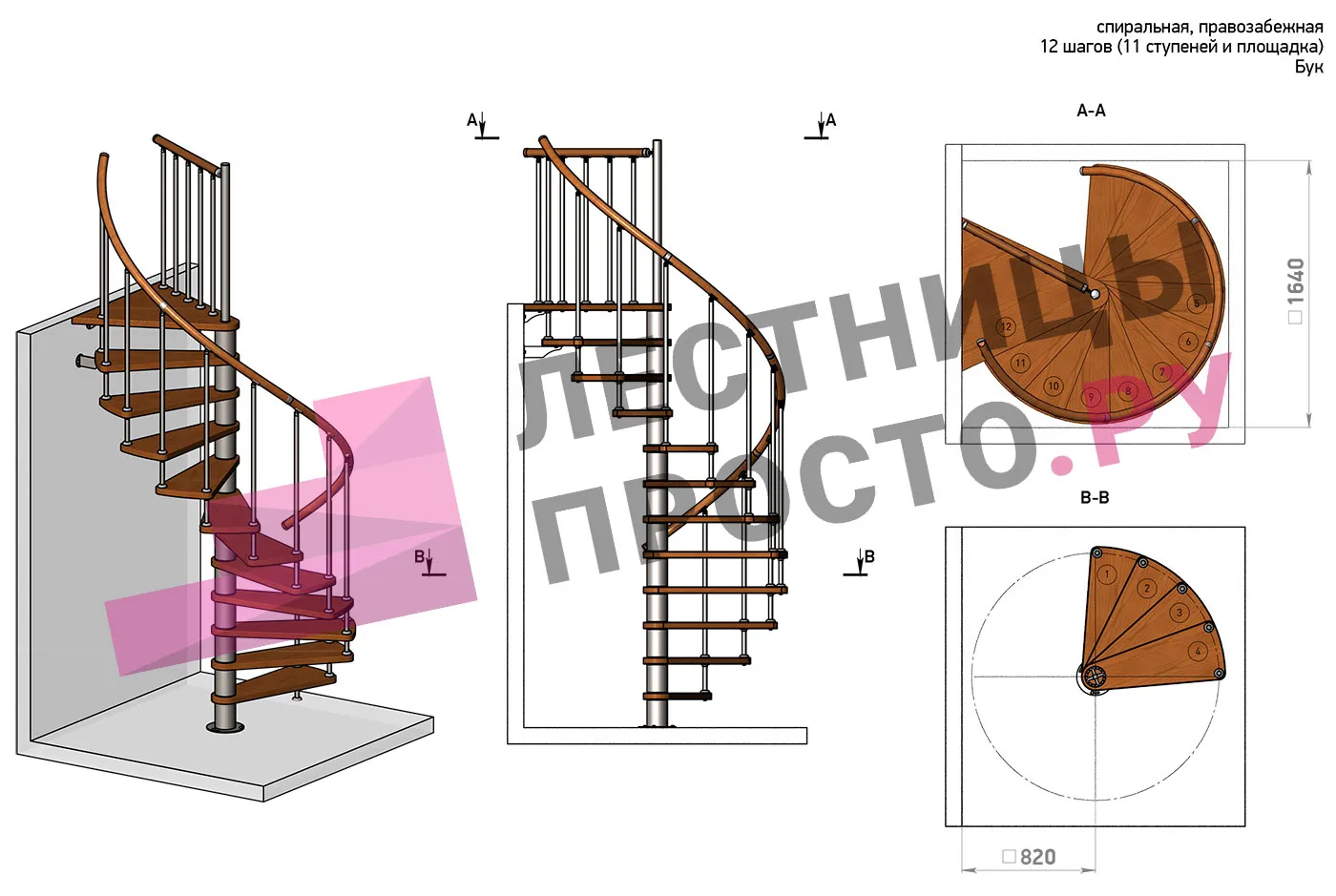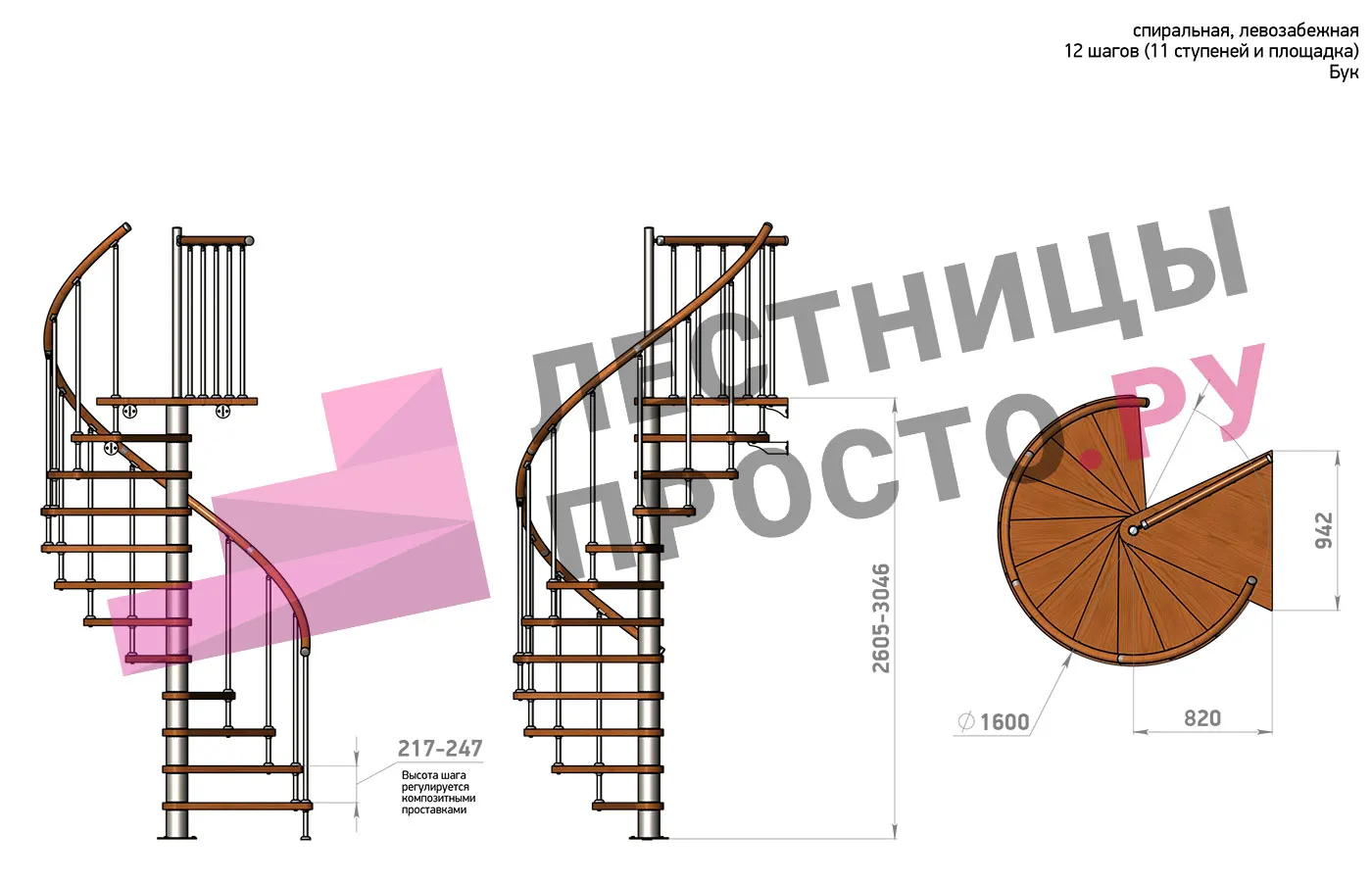 Решение о направлении поворота принимается при сборке лестницы - универсальная конструкция позволяет собрать правозабежную и левозабежную лестницы. Высота ступеней регулируется с шагом 3 мм. в пределах 217-247 мм., благодаря чему, лестница прекрасно подгоняется под необходимую высоту.