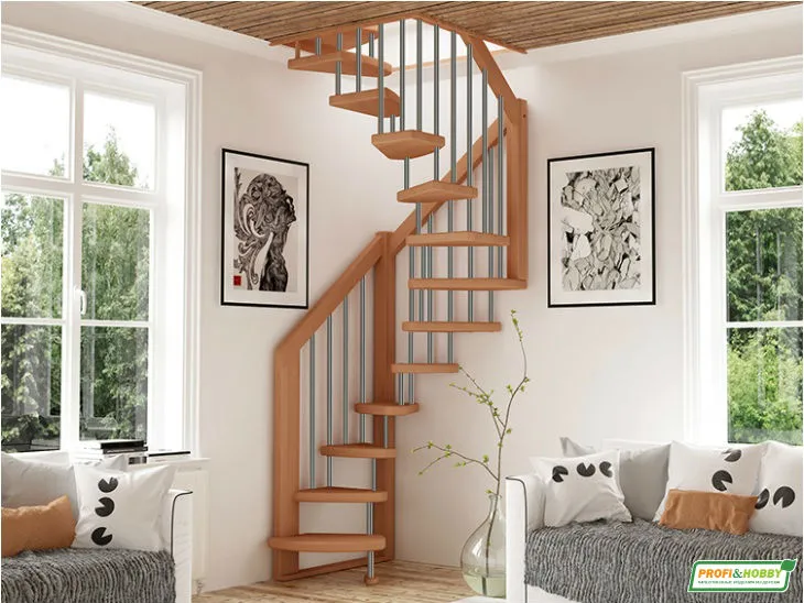 Компактная надёжная лестница. Ступени толщиной 30 мм, изготовлены из массива берёзы по технологии Multiplex, лакированные. Все металлические части оцинкованы горячим способом и покрыты порошковой краской - черного цвета; Лестница имеет надёжную несущую стальную конструкцию.