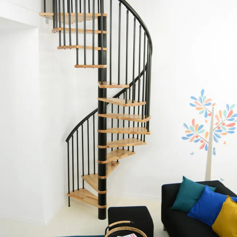 Ступени лестницы изготовлены из бука по технологии MULTIPLEX и покрыты износостойким защитным лаком. Лестница монтируется как по часовой стрелке, так и против. Возможен монтаж в круглый или квадратный проём. Ограждение: стальные трубки, Ø25 мм RAL 9006. Поручень: гибкий цельный ПВХ-поручень Ø40 мм серого цвета. Конструкция и балюстрада окрашены порошковым способом в серый цвет (RAL 9006).